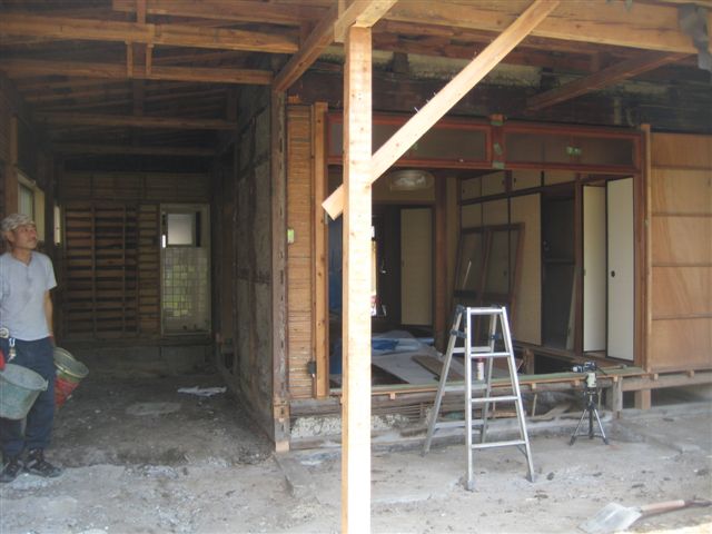 ベニヤを剥がしたら、真壁の土壁が出てくるとは予想してたのですが、意外や大津壁が登場。柱は塗りがかかっている。壁の状態もそんなに悪くなく、味があるといえばある。が、そのままで使うにはちょっと苦しいかな。