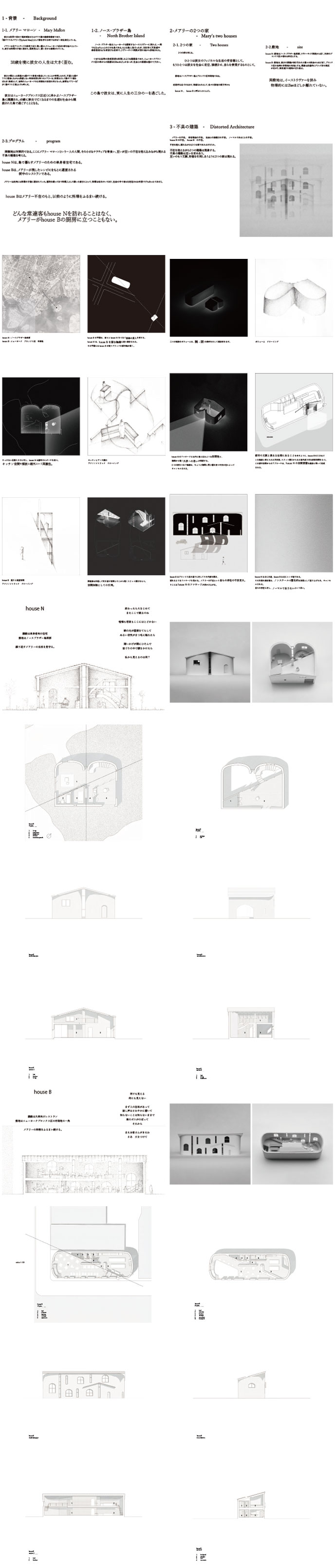 料理人、メアリー・マローンは腸チフスの健康保菌者という特殊体質から20世紀初頭のニューヨークを騒がせ、社会から隔離された孤島でその生涯を終えた。彼女の 不運な人生をモチーフに、2つの家を考える。一つはメアリーのフィジカルな生活の受容器として、もう一つは彼女を社会に定位、接続するものとして。一つは島でメアリーが暮らす単身者向け住宅である。もう一つは彼女の残したレシピをもとに運営される街中のレストランである。互いに不在を抱え、離れてしまった不完全な家は、それでも家であれるだろうか、ということ想像し制作した。