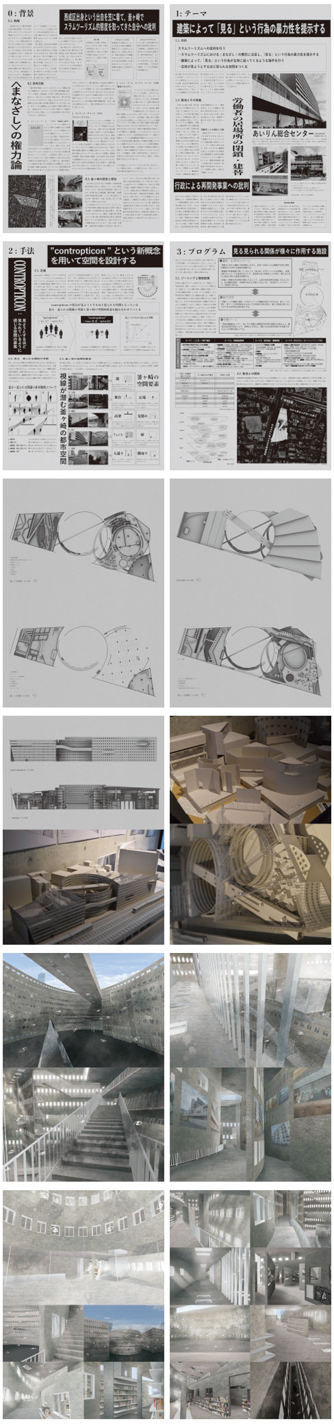 スラムツーリズムへの批判として、その「まなざし」に注目し、「見る」という行為の暴力性を提示する。建築によって「見る」という行為の暴力性が主体に返っていくような操作を行うため、「見ようとするほど見られる空間」を作る。「見ようとするほど見られる空間」の要素として”contropticon"という新概念を提案し、見るー見られる関係の考察と釜ヶ崎の空間的要素を組み合わせて作る。それにより建築を構成し、あいりん総合センターの建替案とすることで、釜ヶ崎におけるスラムツーリズムへの批判とした。